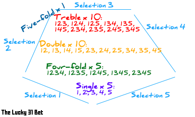 Now this is a bet! You pick 5 selections, and 31 total bets are generated for you. It's a mammoth bet. To get an idea of how this can work in the real world, just click here. In the example, I have two short priced favourites and the rest are outsiders. Change the status column in the calculator to Win / Lose for different combinations of the selections. This will help you get a feel for how losing selections can affect your profits. Notice how it's not a complete disaster even if all long-shots lose. And notice how just 3 winners will leave you nicely in the money. The Lucky 31 give you even more chance of winning than the Canadian.